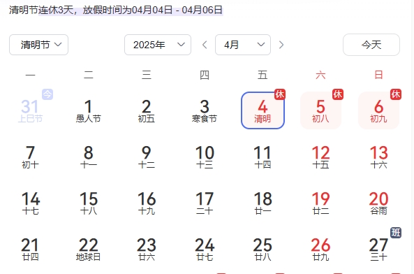 根據(jù)國(guó)家2025年春節(jié)放假通知并結(jié)合本司實(shí)際情況,放假做以下調(diào)整:1、放假時(shí)間:2025年4月4日至2025年4月6號(hào),共3天,3月7號(hào)正常上···